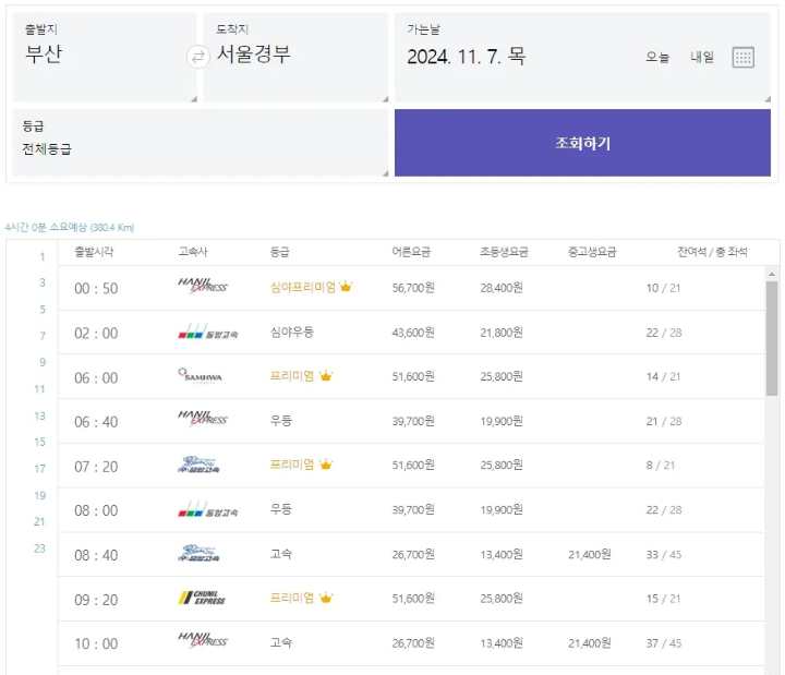 4. 노선을 선택한 후 시간표가 확인이 되면 잔여좌석을 확인 후 선택을 합니다.